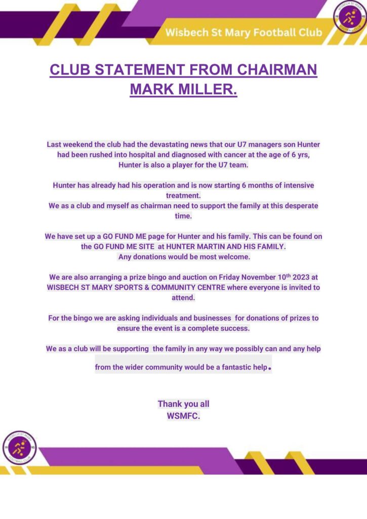A club statement from Wisbech St Mary FC Chairman Mark Miller has been released;