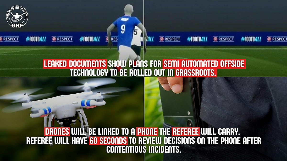 Leaked documents show plans for semi automated offside technology to be rolled out in grassroots. Drones will be linked to a phone the referee will carry. Referee will have 60 seconds to review decisions on the phone after contentious incidents……. Haha,...
