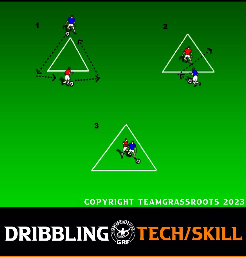 2: One player is in the triangle without a ball while the other is on the outside with a ball. The player with the ball has to try and get through the triangle without getting tackled by the defender to score. If they get tackled then the players swap roles.