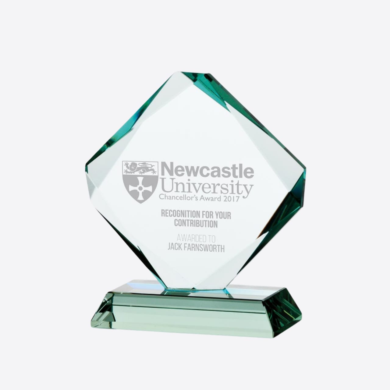 The Accord Jade Glass Award is an elegant and contemporary recognition piece designed to celebrate achievement with style and distinction. Expertly crafted from 15mm thick jade glass, this award features a striking diamond-shaped design complemented by smooth bevelled edges, delivering a refined, high-end finish suitable for any professional setting.