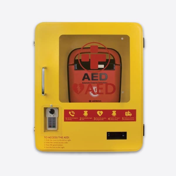 This outdoor wall mounting cabinet offers you security, practicality, high visibility, weather resistance and peace of mind in the event of an emergency. The cabinet is manufactured from thick carbon steel with the addition of a shatterproof transparent window, allowing you to quickly check the status of your defibrillator. Finished in striking yellow, with the added features of a waterproof seal and user regulated temperature settings, the cabinet also includes AED instruction icons to guide users on the correct procedure.