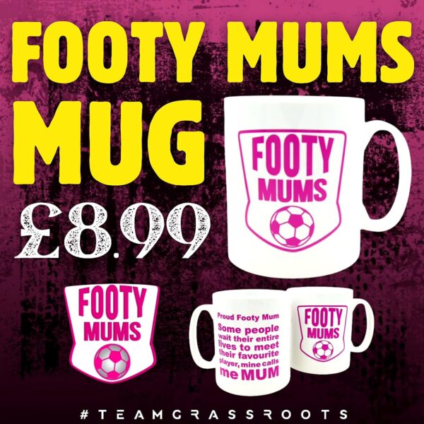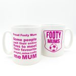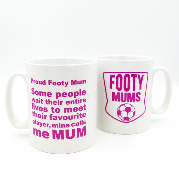 Footy Mums Mug, designed in the classic shaped Cambridge mug that sits on any desk in any office, kitchen, workshop, studio, factory, garden everywhere.