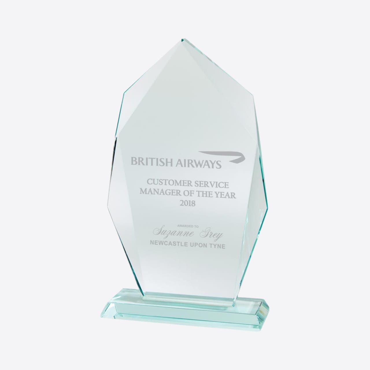 Set on a solid jade glass plinth with bevelled edges, the award offers a contemporary look while remaining sturdy and substantial