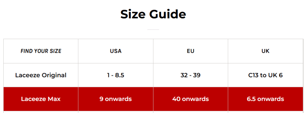 Fits all footwear from child 13 up to and including UK size 6 for size UK 6.5 onwards see Laceeze MAX