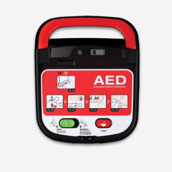 The unit is supplied with a protective outer cover, which when opened by the easy sliding switch, automatically turns on. The defibrillator pads are already connected and ready to use. LED indicator lights flash with the corresponding voice prompts. Visual icons clarify the necessary actions. The adult/paediatric mode switch allows the correct setting without changing the pads. The battery is disposable, LiMnO2 Non-rechargeable, with 2 years shelf life, and 5 yrs standby life.